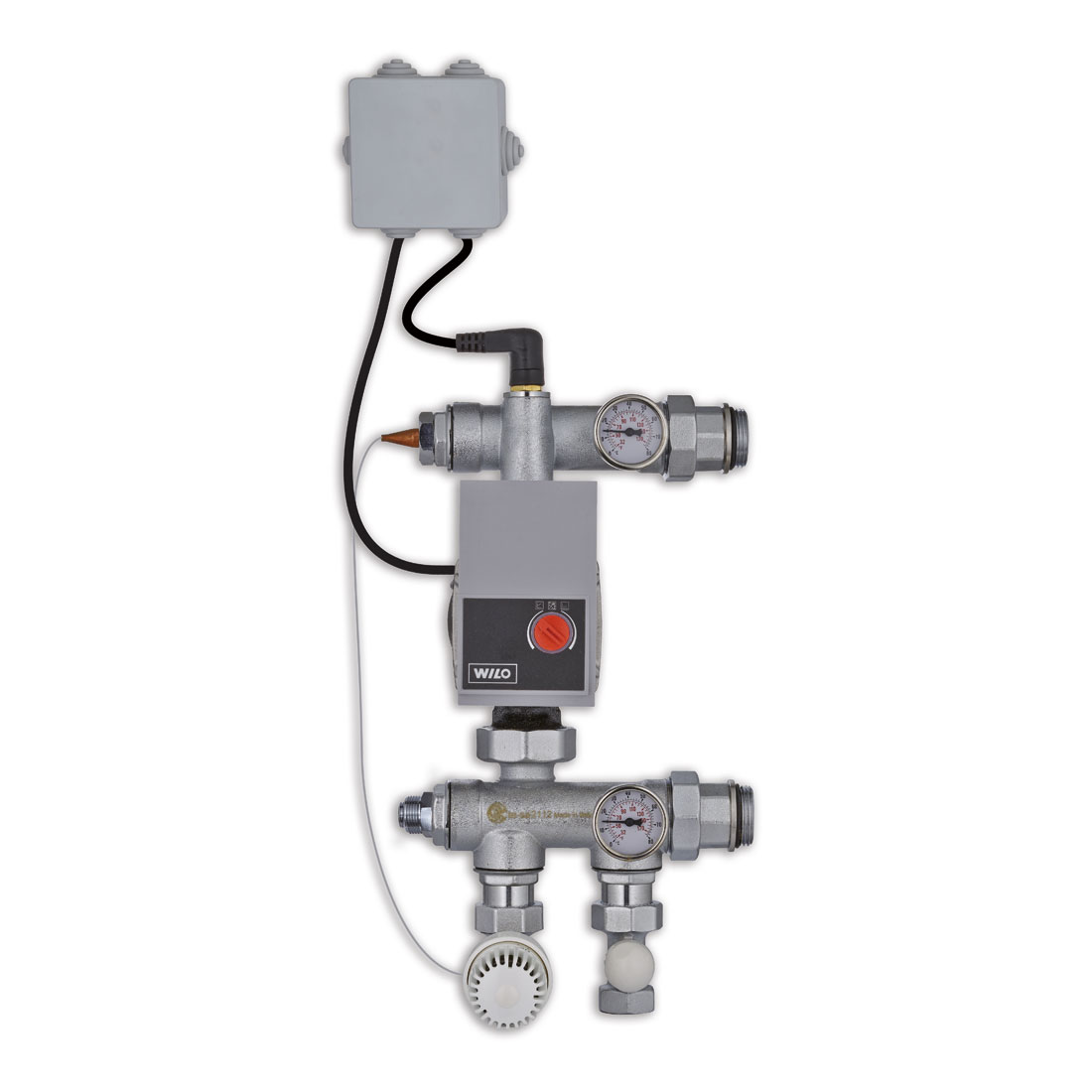 Группа терморегулировки с фиксированной точкой, с нижним подключением к первичному контуру, в комплекте с электронным циркуляционным насосом Y25/6 или Y25/7, защитным термореле на 55°C, балансировочным клапаном регулировки, термостатическим клапаном и термостатической головкой. Диапазон настройки 20÷65°C.Питание 230 В – 50 Гц. Встроенный кабель с коробкой подключения
